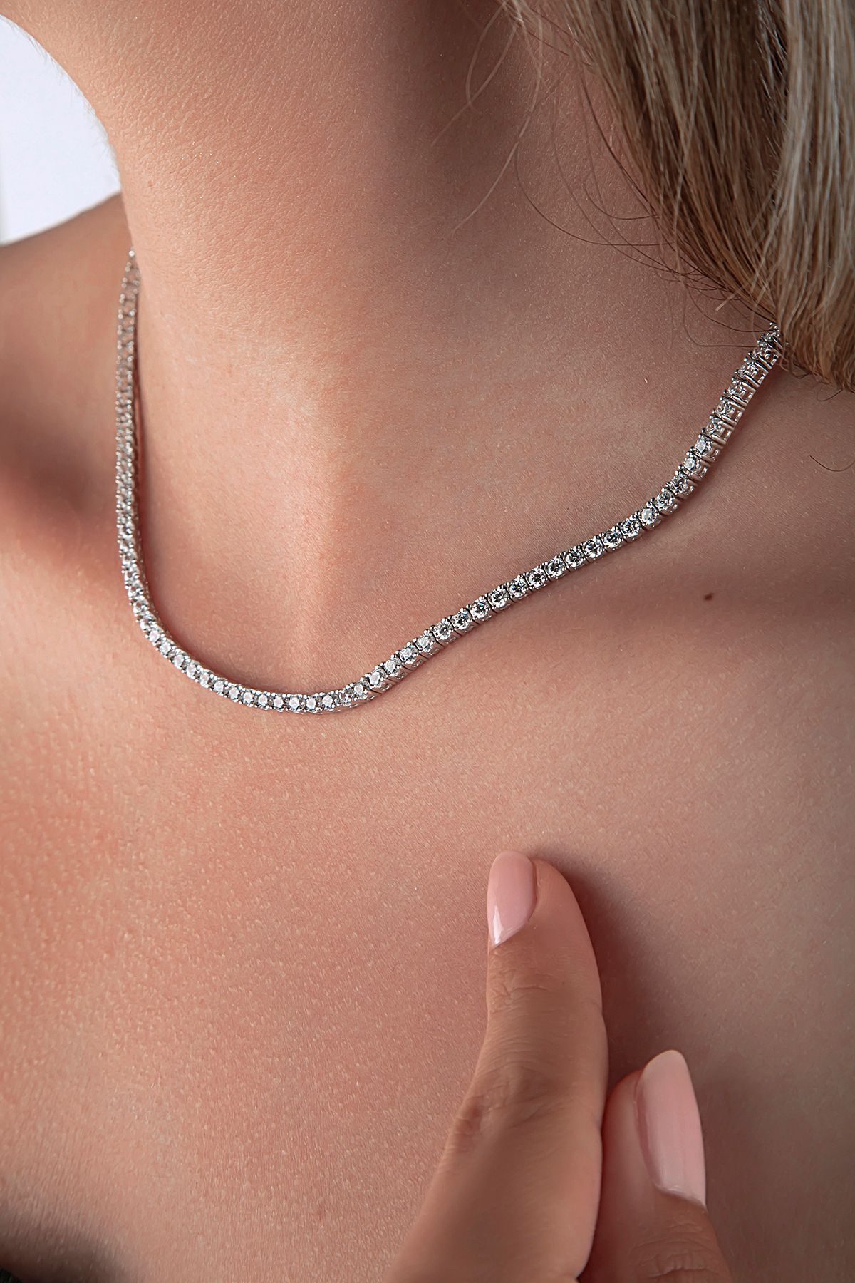 925 ayar gümüşten üretilen kolye, hipoalerjenik yapısı sayesinde cilt dostudur ve gün boyu konfor sağlar. Geniş taş dizilimiyle boynunuzda gösterişli bir duruş sergiler.