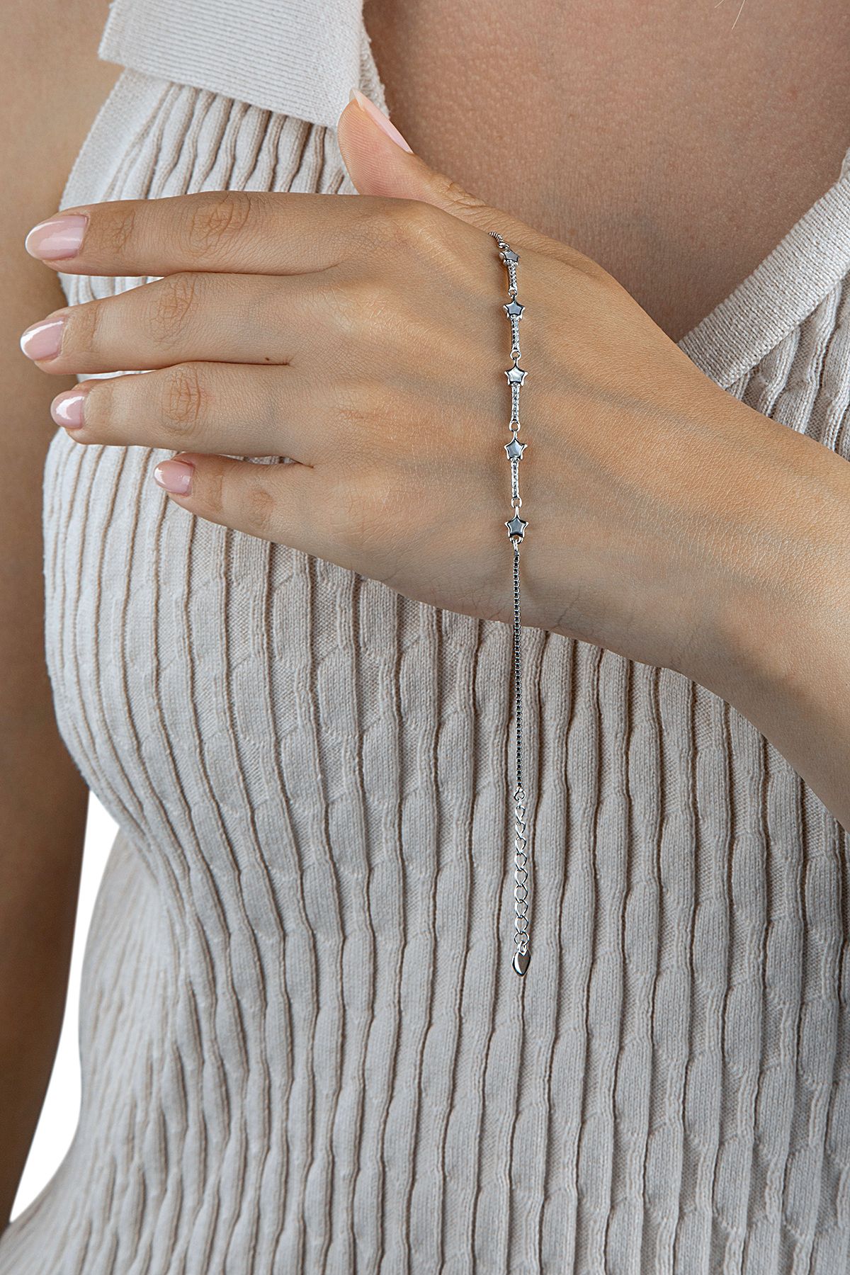 925 Ayar Gümüş Yıldız Motifli Sedefli Bileklik, gökyüzünden ilham alan zarif tasarımıyla stilinize romantik ve mistik bir dokunuş katar. Yıldız formundaki motif, inci beyazı sedef dolgusu ile bütünleşerek bileğinizde dikkat çekici bir ışıltı oluşturur.