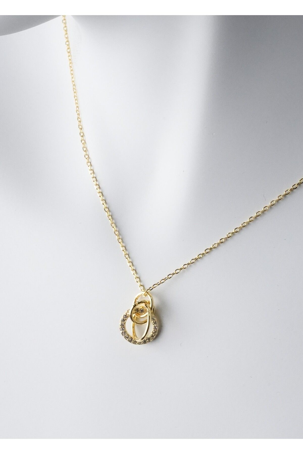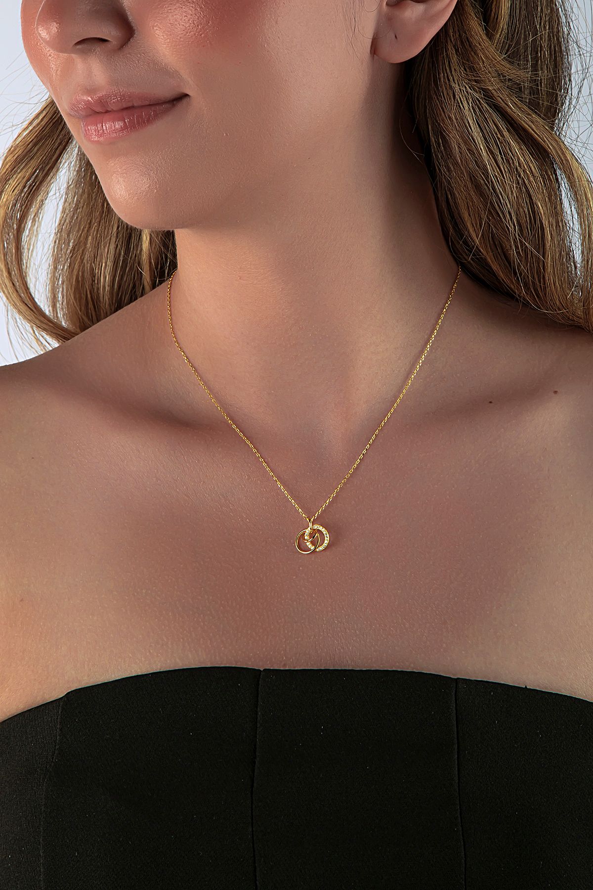 Altın Kaplama 925 Ayar Gümüş İç İçe Halkalı Kolye, zarif ve anlamlı tasarımıyla dikkat çeker. İç içe geçmiş halka figürü, birlikteliği ve sonsuz bağı simgelerken altın kaplama yüzeyi ile ışıltılı bir görünüm sunar.