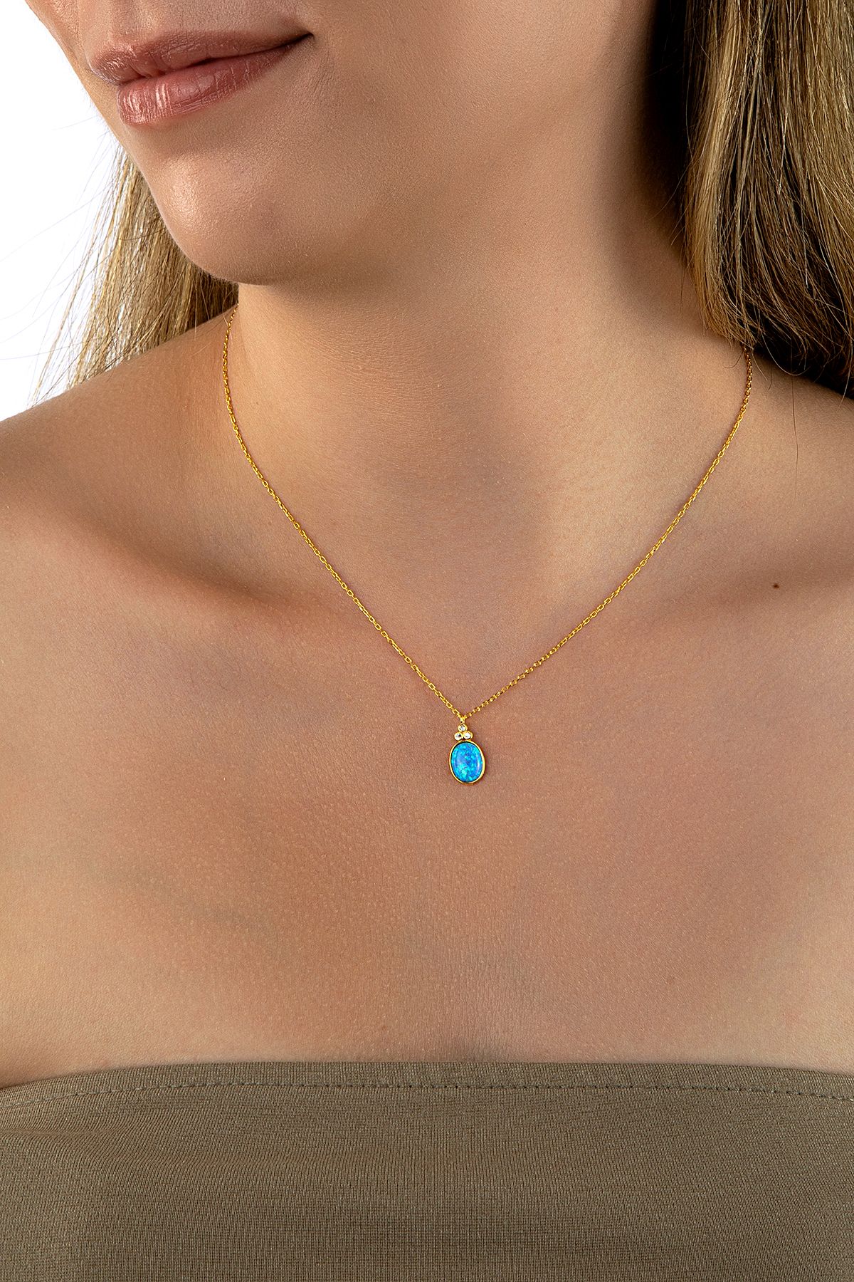 Altın kaplama 925 ayar saf gümüş kullanılarak tasarlanan bu kolye, oval kesim mavi opal taşı ile dikkat çeker. Mavi opalin büyüleyici tonu ve altın kaplamanın ışıltısı, kolyeye sofistike ve modern bir hava katıyor. Hem günlük hem de özel günlerde kullanıma uygun hafif ve rahat tasarımıyla uzun ömürlüdür. Hipoalerjenik yapısı sayesinde hassas ciltlerde de güvenle tercih edilir. Kendiniz veya sevdikleriniz için şık ve anlamlı bir hediye seçeneğidir.